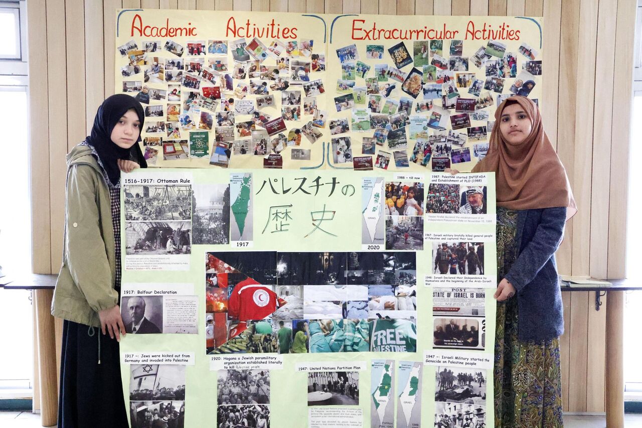生徒らは授業でパレスチナについて学び、ポスターや絵、習字などで平和を求めるメッセージを表現した。